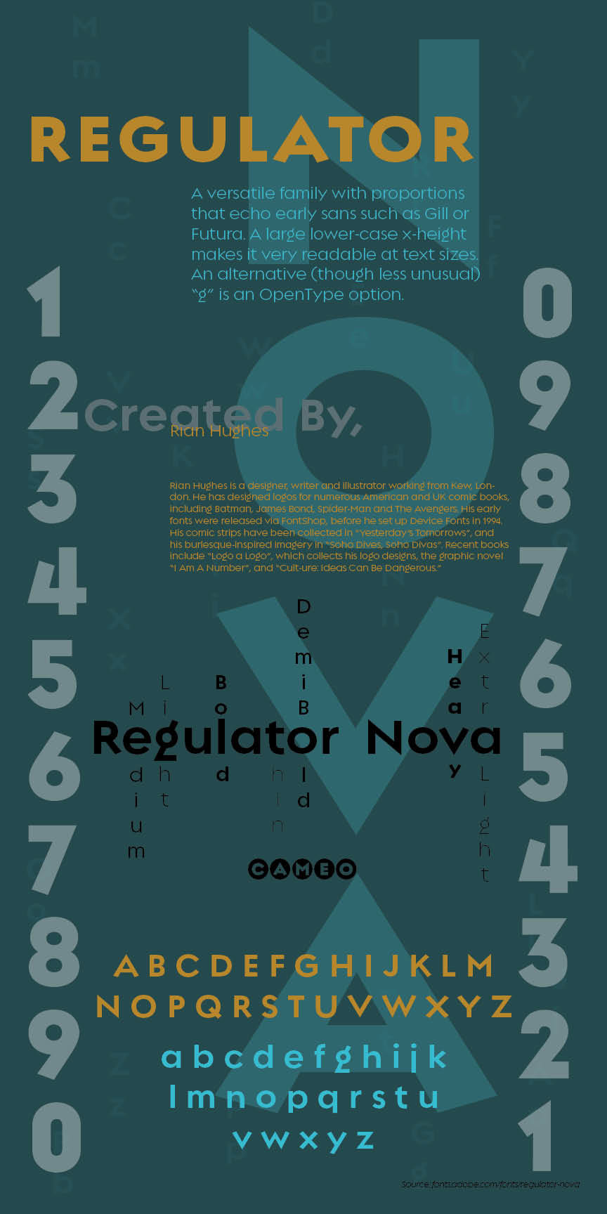 Made to showcase the Regulator nova typeface. showing a visual example of each of the font styles available in the family.